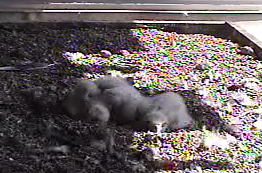 These are George and Gracie's chicks waiting for an adult to bring their next meal. Click on the link at the end of this post to visit the live falcon cam.
