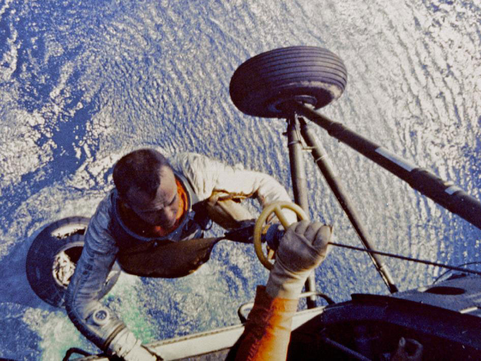 On May 5, 1961, NASA astronaut Alan Shepard piloted his Freedom 7 Mercury capsule in a 15-minute suborbital flight, becoming America’s first astronaut. In this image, he being hoisted aboard a U.S. Marine helicopter after splashdown. The flight carried him to an altitude of 116 miles.